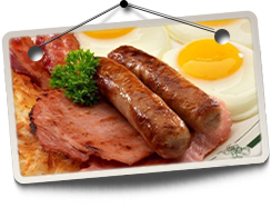 (Served anytime) Three Eggs (any style) two strips of bacon, two sausage links or one patty, our oven baked ham, hash browns, toast & jelly.