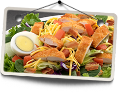A fresh bed of lettuce with crispy chicken tenders, bacon bits, shredded cheddar cheese, tomato and hard-boiled egg.